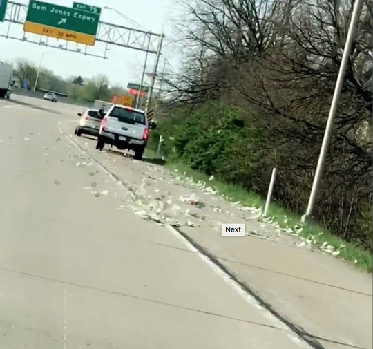Tiền rơi ra từ chiếc xe tải trên đường cao tốc liên bang I-70. Ảnh: Fox59